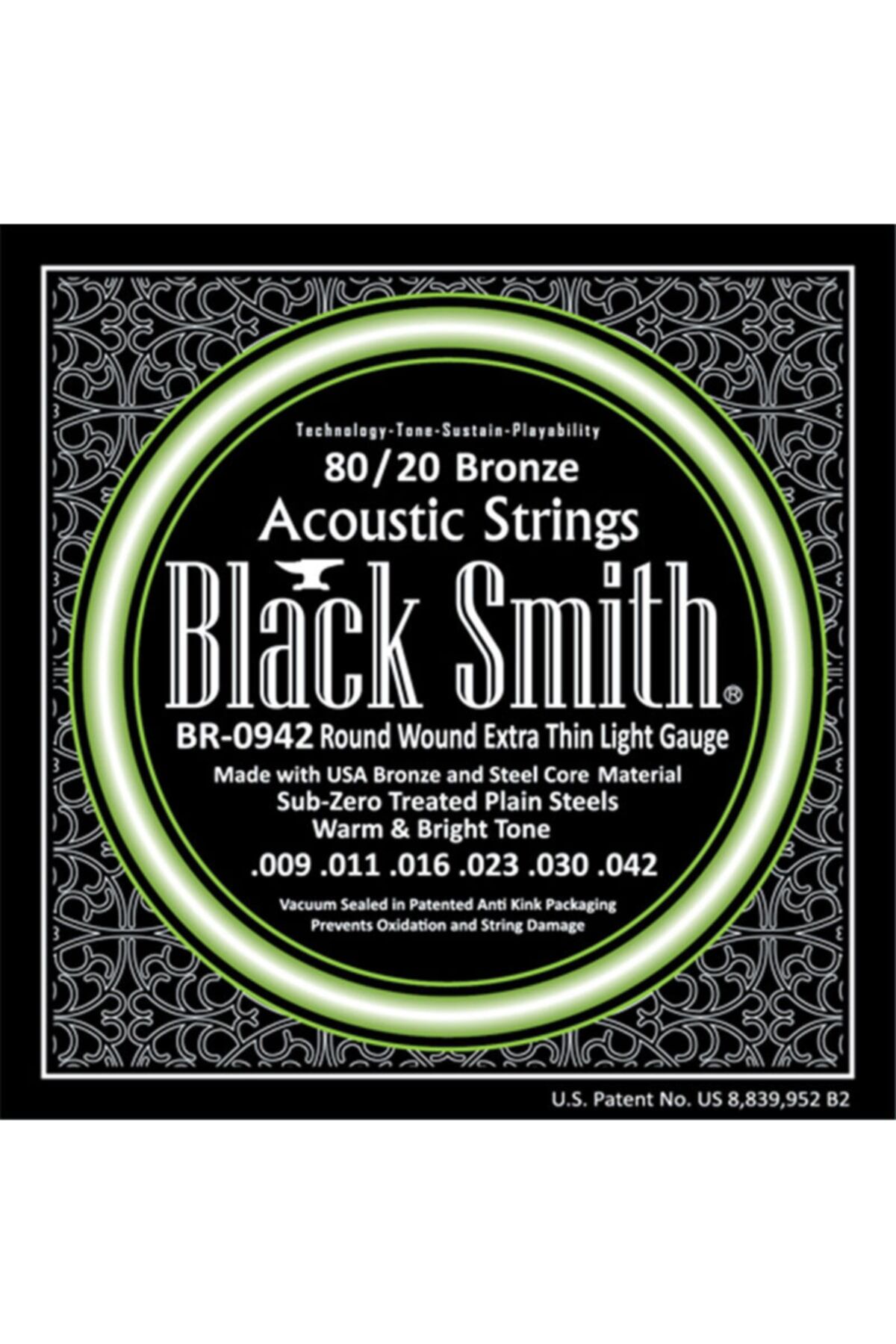 Black Smith BR-0942 Extra Thin Light Akustik Gitar Teli 009Black Smith BR-0942, Extra Thin Light (009 - 042) Akustik Gitar Teli80/20 Bronze Acoustic Strings BlackSmith acoustic guitar strings are made with the finest materials and manufactured using state-of-the-art automatic servo controlled winding equipment. ; USA made 80/20 bronze and steel ensures a long lasting string with increased sustain and extra-bright tone. ; Our proprietary computer controlled winding technology produces strings with a very consistent wrap surface and even tension, resulting in stable tuning, accurate intonation, and superior playability. ; Sub-Zero treated plain steel strings offer brilliant tone with a silky feel. ; With BlackSmith acoustic guitar strings, you will experience the perfect balance of consistency, tone, and playability. ; Vacuum Sealed in Patented Anti Kink Packaging Prevents Oxidation and String Damage. ; BR-0942 - BlackSmith's lightest gauge 80/20 Bronze acoustic string set, ideal for beginners or players who prefer a soft, yet bright tone and maximum string flexibility. ; Known for its bright tone and playing ease.80/20 Bronze Acoustic Strings BlackSmith acoustic guitar strings are made with the finest materials and manufactured using state-of-the-art automatic servo controlled winding equipment. ; USA made 80/20 bronze and steel ensures a long lasting string with increased sustain and extra-bright tone. ; Our proprietary computer controlled winding technology produces strings with a very consistent wrap surface and even tension, resulting in stable tuning, accurate intonation, and superior playability. ; Sub-Zero treated plain steel strings offer brilliant tone with a silky feel. ; With BlackSmith acoustic guitar strings, you will experience the perfect balance of consistency, tone, and playability. ; Vacuum Sealed in Patented Anti Kink Packaging Prevents Oxidation and String Damage. ; BR-0942 - BlackSmith's lightest gauge 80/20 Bronze acoustic string set, ideal for beginners or players who prefer a soft, yet bright tone and maximum string flexibility. ; Known for its bright tone and playing ease.;